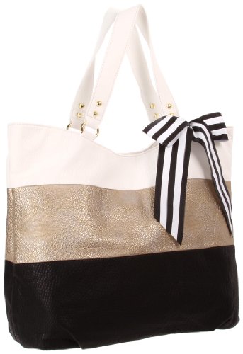 Go for a dainty look all year round with this sensational Steve Madden handbag. Made of colorblock faux leather. Dual shoulder straps. Brand logo plaque. Feminine bow accent. Magnetic snap closure. Features one zipper and two slip pockets. Lined interior. Imported. Bottom Width: 16 in ; Middle Width: 17 in ; Top Width: 17 in ; Depth: 4 in ; Height: 12 1 2 in ; Strap Length: 18 in ; Strap Drop: 9 in ; Weight: 1 lb 1 oz
