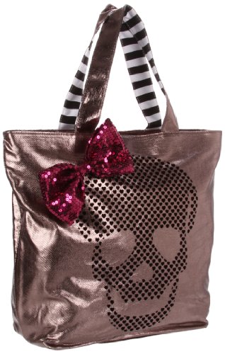 Stand out in a crowd with this awesome bag from iconic designer Betsey Johnson! This bag features metallic man-made leather construction with front flocked hearts in the shape of a skull graphic, giant pink sequined bow, and black and white stripe detail on inside of straps. Zipper closure opens to word bubble pink printed inside, large zipper pocket, cell phone pocket and square open pocket. Also features gunmetal Betseyville logo. Strap drop, 8" chain. Style: BV66310