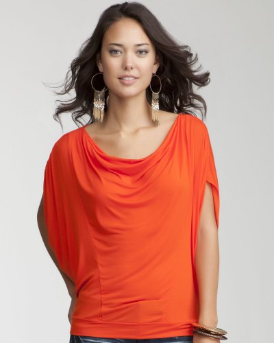 Luxurious and dramatic drape make this bebe top a hot way to elevate your casual look. Offers super soft texture. Try it with denim with a statement necklace or with a pair of metallic jeans for a going-out look. Center back to hem: 22"/56 cm.
