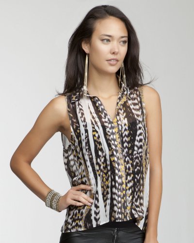 Made from luxurious silk, hi-lo hem and featuring a warm color palette, this sheer bebe sleeveless tank exudes safari-chic. Offers an ultra lightweight drape. Try it with a black cami, white skinny jeans and oversized hoops. Center back to hem: 28"/71 cm.